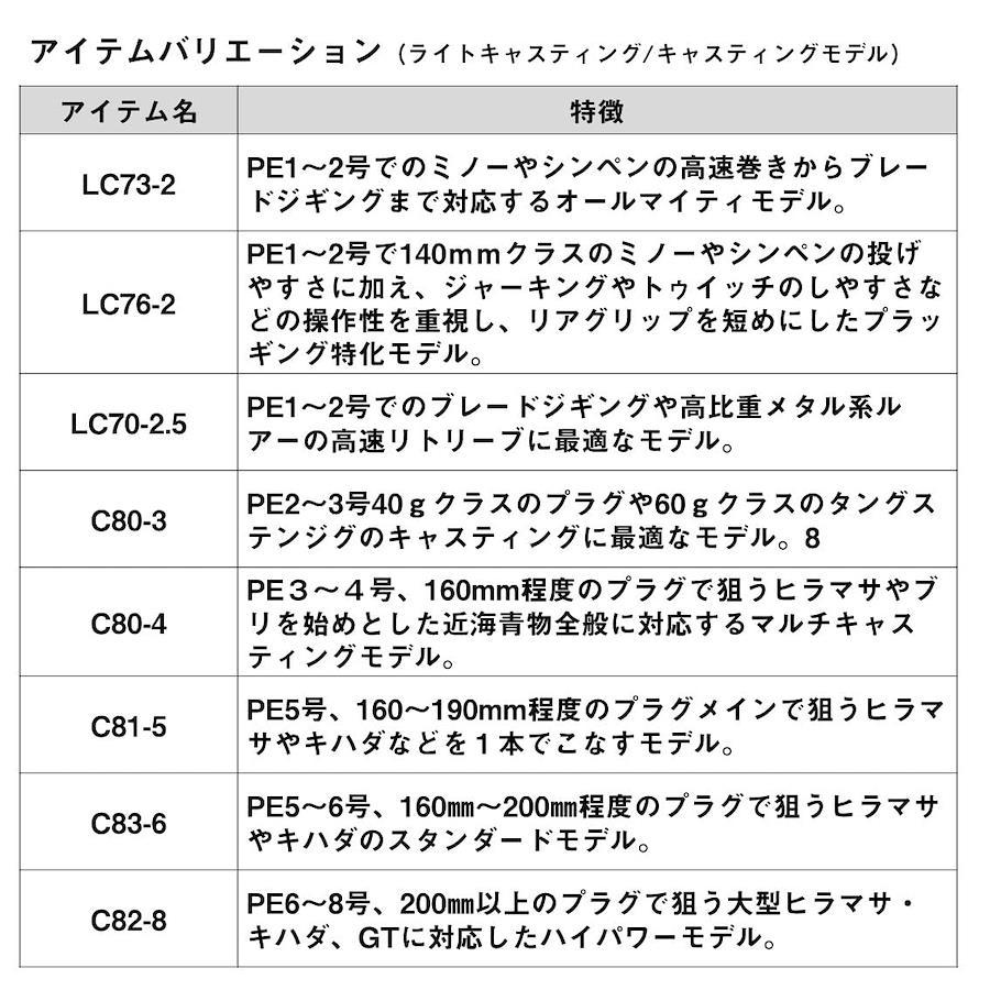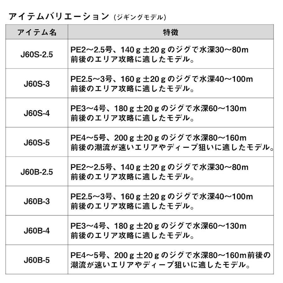 PE4~5号、200g±20gのジグで水深80~160m前後の潮流が速いエリアやディープ狙いに適したモデル。ヘビーパワーのジギングロッドにありがちなブランクの張りによる体への負担を極力抑えつつ、強いトルクを持たせたバランス設計により、ファイト時も魚をしっかりリフトできる。ターゲットは10~15kgクラスの大型青物や、より重量のあるジグを使用した大型キハダやトンボ狙い、エビングなどにも対応可能な1本。