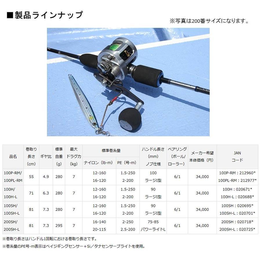 PEライン1.5号が250m巻ける100サイズと、PEライン2号が250m巻ける200サイズの2つのボディ展開。100サイズ、200サイズともボディの径は同じで横幅が異なる。両サイズとも高さ49mmというロープロファイル設計のため、しっかり握り込める優れたホールド性を有する。