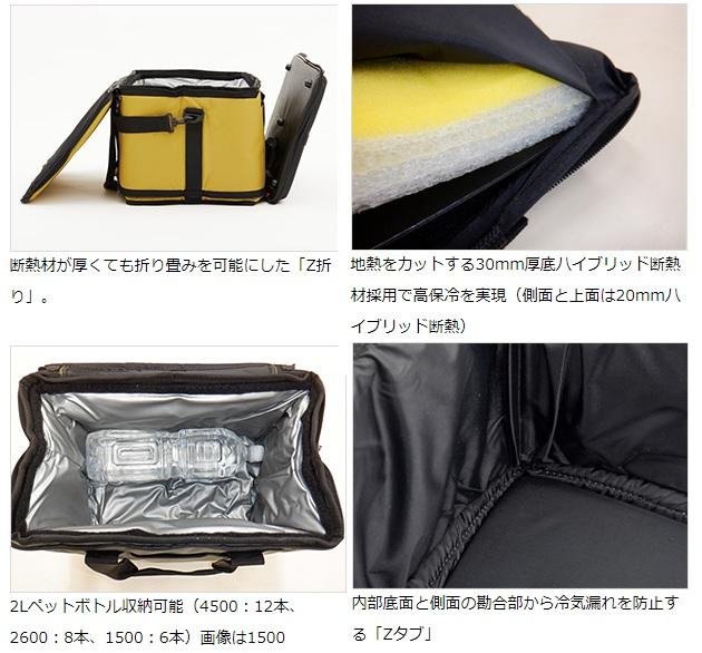 ソフトクールが更なる進化。ハイブリット断熱構造を採用して折り畳み性能はそのままで高保冷化を実現。●7層断熱構造を採用して保冷力を強化(断熱部は従来ソフトクールは発泡ポリエチレンのみ、EXは発泡ポリエチレン+発泡ウレタン)。地熱をカットする30mm厚底断熱材採用で高保冷を実現(壁面の断熱材厚さは20mm)。買い物カゴやマルチバスケット(別売)をそのまま収納可能(4500、2600)。高保冷力・コンパクト収納を実現する「Zシステム」搭載/内部底面と側面の勘合部から冷気漏れを防止する「Zタブ」。内容物を上下から効率よく冷やす「Z冷却」。断熱材が厚くても折り畳みを可能にした「Z折り」。氷や魚をそのまま収納できるPVCインナー。ワンタッチで装着でき丸洗い可能。ハンドルには服やベルトが汚れにくいショルダーベルト固定機能付き。底面素材は吸水しないPVCを採用。濡れ・匂い・汚れもサッとひと拭き。底面内側にタオルを配置しておけば結露を給水。本体正面にポケット付き。本体底面が汚れにくいゴム脚付き。 容量:45L 自重:1.9kg 内寸:48×32×27cm 外寸:51×35×30cm ※実物と色が違って見える場合があります。あらかじめご了承下さい。