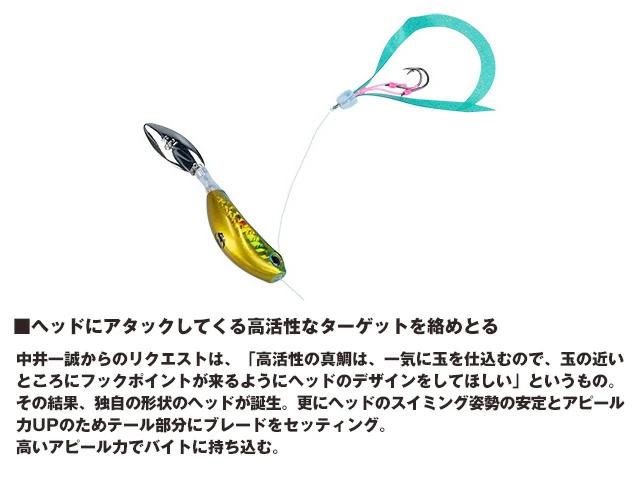 中井一誠氏が提唱する、”真鯛の活性を上げて効率的に釣る”タイラバ新メソッド”玉噛みコンセプト”。ヘッドにダイレクトに当てってくる真鯛に対し、フッキング性能を向上させるために、ヘッドに近い位置にフックポジションがくるように新たにデザイン。高比重タングステン素材による確実なタッチアンドゴーとブレードによるアピールで強烈にターゲットにアピール。