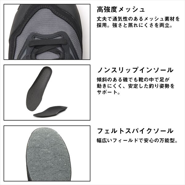 荒磯に立つ、その一歩を支える磯シューズ。磯に立つ瞬間、胸が高鳴る。でも、同時に感じるのは「足元の不安」。ダイワのフィッシングシューズは、そんな釣り人の一歩を支えるために生まれた。強度と動きやすさを両立したデザイン、足首までしっかり守る安心のミッドカット設計。つま先やかかとをガードするカップ型アウトソールが、荒磯でのぶつけやすいシーンにも対応。求められるのは、安心感と使いやすさ。そのどちらも兼ね備えたこのシューズで、磯での釣りへ一歩踏み出そう。 サイズ:27.5 カラー:レッド ソールタイプ:フェルトスパイク 防水仕様:非防水 ※実物と色が違って見える場合があります。あらかじめご了承下さい。