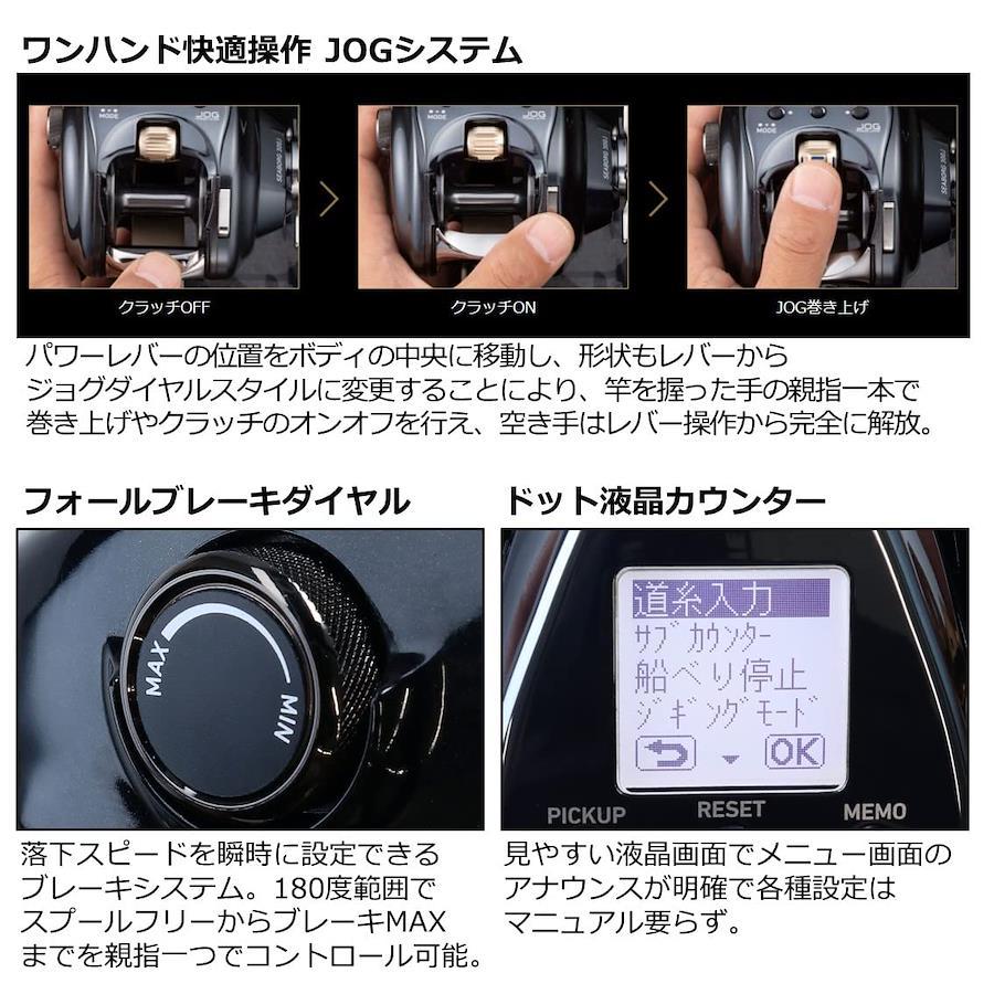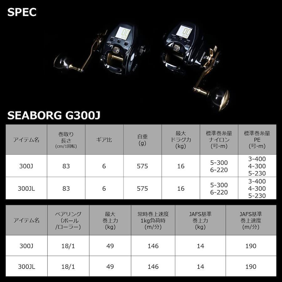 SEABORG 300Jをベースに更なる高耐久を実現したTOUGH LIGHT MONSTER。 心臓部にはMAGMAX-Gモーター(3年保証)を搭載し、ベースの4倍の耐久性を実現。 高耐久ブラシモーターだからレスポンスの良い回転フィーリングとパワーを生み出す。 また操作性においてはモーターON/OFF連動クラッチを搭載。 JOG巻上げ位置はそのままで、クラッチON時のレスポンスの良い立ち上がりと、 クラッチOFF時にはモーター停止によるフォール時でのアタリを捉える優れもの。 機能面では「ジギングモード」「デプスアラーム」「電子ドラグサウンド」を追加。 手巻きにおいて、ハンドル1回転83cm巻取長に、75-85mm可変ハンドルアームで SALTIGA両軸同等の誘いが可能。 レベルワインド内径3.0mmはショックリーダー30号も通る安心設計。 ワンランク上のターゲットはもちろん、電動ジギングにも対応するタフセッティング。 自重575gは手持ちで快適であり、その軽さは感度に繋がる。