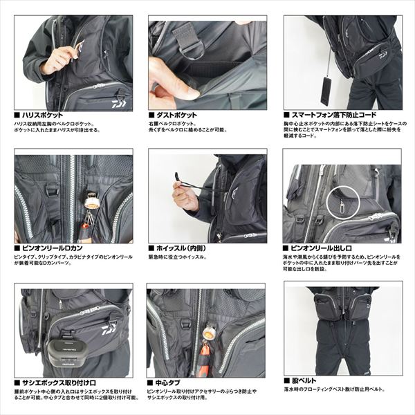 磯釣りに特化した多機能で、ハードな環境にも対応する強靭かつ軽量な磯フロートベストが登場。設計を見直し軽量化を実現。長時間の実釣時の負担を軽減。スマートフォン落下防止機能を新設。ロッド操作の操作性を考慮し肩甲骨の可動域を妨げない背面カッティング。最近の大型スマートフォンが収納可能な中央ファスナーポケット(ケースサイズにより入らない場合もあります)。ご好評の取り外し式のサーモハッチバック機能。取り外し式の為刺繍やプリントの加工がしやすくなる。海水や潮風からくる錆びを予防するため、ピンオンリールをポケットの中に入れたまま取り付けパーツ先を出すことが可能な出し口を胸ポケット底に新設。腰前ポケット中心側の入れ口はサシエボックスを取り付けることが可能。中心タブと合わせて同時に2個取り付けができる。ピンタイプ、クリップタイプ、カラビナタイプのピンオンリールの装着が可能なDカンを採用 サイズ:L カラー:グレー 自重:約1.1㎏ 着丈サイズ(目安):53cm(Lサイズ) ※実物と色が違って見える場合があります。あらかじめご了承下さい。