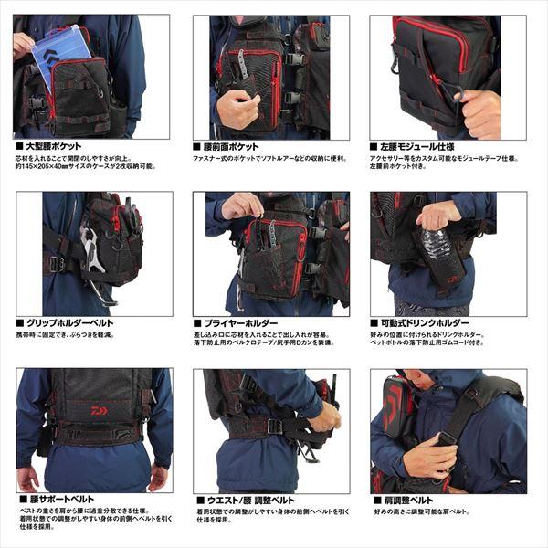 フラッグシップに迫るハイスペックな機能を搭載したアクティブモデル。ポイントを見極め移動しながら魚を狙うアングラーにおすすめ。肩にかかる負担を大幅に軽減する腰ベルト分散方式を採用!タックルの重み身体への負担を腰へ分散。肩ベルトのクッション性UPで肩への負担を軽減。肌面はグリップ材に変更し、肩のずり下がりを防止。ドリンクホルダーを改良。釣行時にも紛失しにくく、取り出しやすい形状にチェンジ。移動可能。背面大型ポケット容量がUP。大型腰ポケットに浮力芯材を入れることで、片手でのファスナー開閉が更に楽に! サイズ:フリー 浮力:7.5㎏/24時間以上 素材:本体:ポリエステル100%(撥水加工)、ポーチ:ポリ塩化ビニル(PVC)、浮力材:ポリエチレン独立発泡材 ※実物と色が違って見える場合があります。あらかじめご了承下さい。