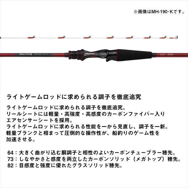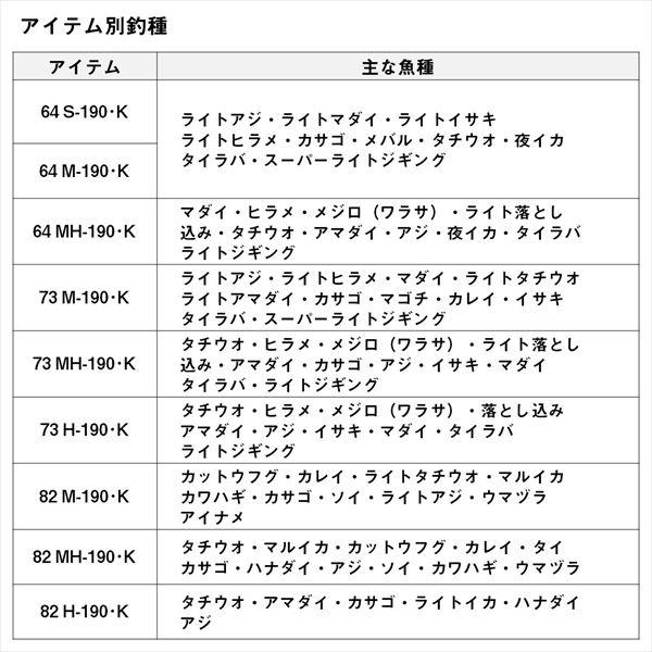 ライトゲームロッドに求められる調子を徹底追求。リールシートには軽量・高強度・高感度のカーボンファイバー入りエアセンサーシートを採用。ライトゲームロッドに求められる性能を一から見直し、調子を一新。軽量ブランクと相まって圧倒的な操作性が、船釣りのゲーム性を加速させる。■73・・・食い込みと操作性に優れた7:3調子。しなやかな穂先とバットパワーの絶妙バランスが幅広いターゲットをカバー。ライトゲームロッドの王道調子。 自重:100g 全長:1.9m 継数:2 仕舞寸法:100cm 先径/元径:0.8mm/9.9mm 錘負荷:20-100号 カーボン含有率:64% ※実物と色が違って見える場合があります。あらかじめご了承下さい。