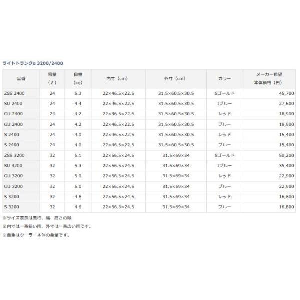 トランク型クーラー最軽量のライトトランクが、更に軽く、更に使いやすくなって新登場。対象魚に合わせて選べる32リットルと24リットルの2サイズ ロングボディーで大型~中型魚までスッポリ収納(32L:内寸56.5cm)ダイワクーラー最軽量を実現 軽いのに座れる頑丈ボディ 開閉便利なワンハンドオープン、フリークローズ 取り外し可能でお手入れ簡単な両開き上フタ 90度まわすだけで開閉簡単な水栓付き 用途に合わせて選べる断熱仕様容量:32L自重:4.6kg内寸(cm):22×56.5×24.5外寸(cm):31.5×69×34