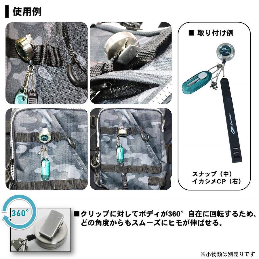 着脱容易なクリップタイプのピンオンリール。堅牢でサビに強いステンレスボディ。スムースにヒモを伸ばせる360度回転式ボディ。ダブルスナップ+極小小物用ステンレスフック搭載。スライド収納式でステンレスが安全に収納できる。
