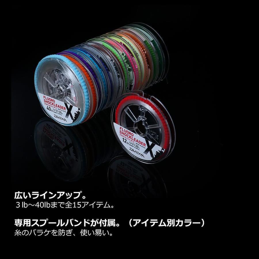 万能、汎用フロロショックリーダー「X」。アジング~ジギングまで様々なターゲット/釣種をカバー。「ショックリーダー」の性能を追求した「しなやか&柔軟リーダー」でショックを吸収し、ラインブレイクを防ぐ。結節強力重視設計で結びに強い。専用スプールバンドが付属(アイテム別カラー)で糸のバラケを防ぎ、使い易い。まさに基本性能がしっかり詰まったザ・スタンダード「ショックリーダー」。