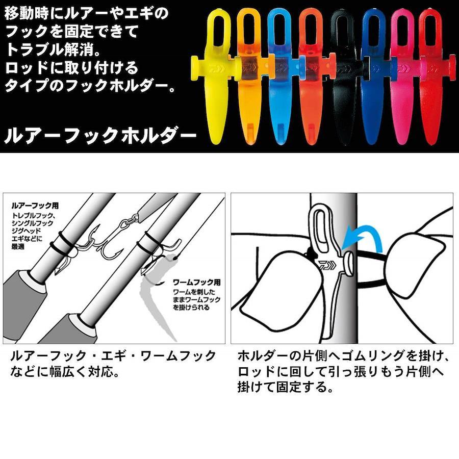 取付可能ロッド径(mm):ゴムリング(大) 10-14mm/ゴムリング(小) 8-10mm入数:フックホルダー×1個、ロッド取付用ゴムリング×大小各1個ルアーフック・エギ・ワームフックなどに幅広く対応。ホルダーの片側へゴムリングを掛け、ロッドに回して引っ張りもう片側へ掛けて固定する。※ゴムリングにキズなどが入りましたら安全のために新しいものに交換してください。【免責事項】※メーカーのリニューアルに伴い仕様・カラー等が予告無く変更になる場合がございます。新パッケージでお届け致します事ご了承願います。