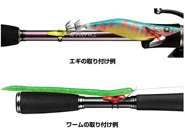 ロッドに取り付けるタイプのフックホルダー。移動時にルアーやエギのフックを固定できトラブル解消。