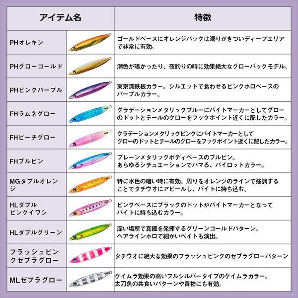 タチウオジギングゲーム対応センターバランス設計。タチウオの捕食行動を研究し、行き着いたセンターバランス設計。鋭く研ぎ澄まされたヘッドにより引き抵抗大幅軽減。アングラーの疲労を抑えながら、刻一刻と変化する食わせの間に柔軟に対応できる。ジャーク時の素直なフォールアクションでジグが横向きになり違和感無くタチウオが口を使う。タチウオの鋭い歯にもはがれにくいHD塗装を採用。フックは別売りの「鏡牙フックSSバラシレストレブル&クワトロ」がベストマッチ。 全長:120mm 重量(g):130 タイプ:センターバランス 素材:鉛 ※実物と色が違って見える場合があります。あらかじめご了承下さい。