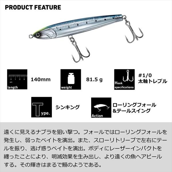 ナブラ直撃!瀕死のベイトフィッシュを演出するドリフトフォール対応ジグミノー!遠くに見えるナブラを狙い撃つ!フォールではローリングフォールを発生し、弱ったベイトを演出。また、スローリトリーブで左右にテールを振り、逃げ惑うベイトを演出。ボディにレーザーインパクトを纏ったことにより、明滅効果を生み出し、より遠くの魚へアピールする。その輝きはまるで鰯のようである。 サイズ:140mm 自重:81.5g タイプ:シンキング 標準装備フック:#1/0太軸トレブル アクション:ローリングフォール&テールスイング ※実物と色が違って見える場合があります。あらかじめご了承下さい。