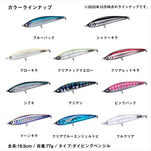 未知なる冒険へ!瀬川良太監修モデル。ソルティガカドラーに求めたものは、飛距離とタフコンディションでもしっかり泳ぐスイムアクションである。テールを絞り込み、空気抵抗を大きく減らし、強い向かい風や横風でもバランスを崩さない安定した飛行姿勢を可能にするフォルムにより、飛距離での大きなアドバンテージを生み出した。また、背面カウンターウエイトを搭載し、浮き上がりの姿勢にこだわり、水面が荒れていても同じ姿勢で浮き上がるように調整し、水面のコンディションを問わない水中へのダイブを可能とした。追求したアクションは立体螺旋S字アクションで、ボディ全体がワイドに動き、広範囲から魚を引き寄せる。 全長:185mm 重量(g):77 タイプ:ダイビングペンシル 推奨フック:トレブル #2/0~3/0、シングル #5/0~7/0 リング:#8 ※実物と色が違って見える場合があります。あらかじめご了承下さい。