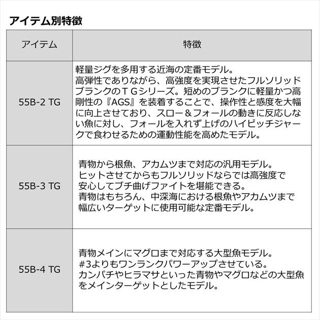 高弾性なのにブチ曲げファイトが可能な次世代フルソリッドSJロッド!■55B-2・・・軽量ジグを多用する近海の定番モデル。55B-2 TGは近海用に設計。小型青物~大型のブリクラスまで近海で狙えるターゲットはほとんどカバー出来るモデル。 全長:1.65m 継数:1 仕舞寸法:165cm 標準自重:114g 先径/元径:1.9mm/6.3mm ルアー重量:120-200g 適合ラインPE:0.8-2.0号 カーボン含有率:99% ※実物と色が違って見える場合があります。あらかじめご了承下さい。