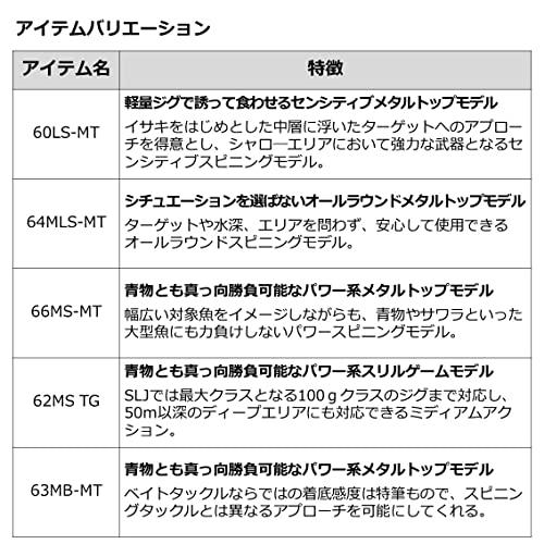 64MLS-MTSLJで多用される15 80gのジグに対応したミディアムライトアクション。ターゲットや水深、エリアを問わず、使用できるオールラウンドスピニングモデル。