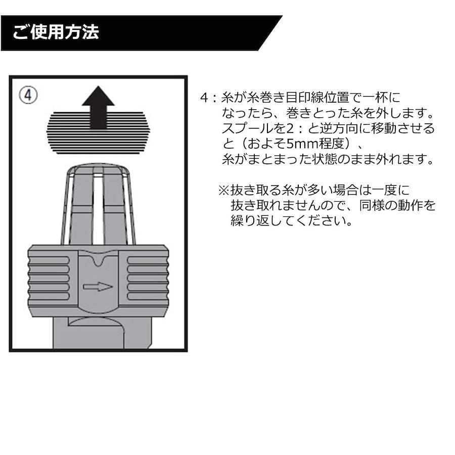 従来の糸抜き器では、糸自体が柔らかいPEラインは巻き込みやすくトラブルのもとになるため、巻取りができませんでしたが、全く違う構造を採用しPEラインの巻取りを可能にしました。引き出し方式ではなく、巻取り方式を採用していますので、巻きとった糸がひとまとめになり、後始末が簡単です。