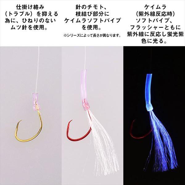 ハリス絡み軽減・エサが漂うケイムラフロート仕様 鬼カサゴ仕掛け。既存の鬼カサゴ仕掛け(2本針)に対して本製品は3本針仕様。3本針仕様になる事で広範囲で探る事が可能になり釣果に直結。天秤仕掛けの弱点であるエダス絡みを軽減させるべく、スイベルの結び後にケイムラフロートパイプで固定。また、同様の針のチモト部分にもケイムラフロートパイプで固定する事により、エサが海底付近で絶妙に漂う仕様。針もヒネリなしのムツ針を使用する事でエサ絡みを軽減した仕様になり、非常に扱いやすい仕掛け。環境対応紙パッケージ。 仕掛全長(cm):180 針:20号 ハリス(号):7 フックタイプ:ムツ ひねりなし 幹糸:8号 ※実物と色が違って見える場合があります。あらかじめご了承下さい。