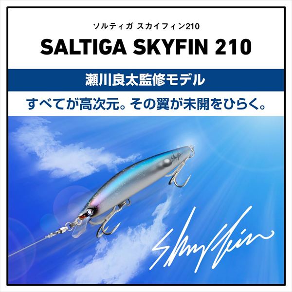 すべてが高次元。その翼が未開をひらく。SALTIGA SKYFIN。それは大型魚を獲るために生まれたビッグミノー。翼を持ち、空を駆けるかのような安定した飛行姿勢と大型タングステンボールによる重心移動システムが、飛距離面で大きなアドバンテージを生み出す。アクションはハイアピールスローロール。大きくゆったりとしたロールアクションが水中で存在感を放ち、遠くのモンスターを呼び寄せる。トップに出ない魚、喰い気のない魚をも自然に口を使わせるには、ミノーは必然。そしてSALTIGA SKYFINは釣り人を新たな領域へと誘う。 全長(mm):210 重量(g):102 ※実物と色が違って見える場合があります。あらかじめご了承下さい。