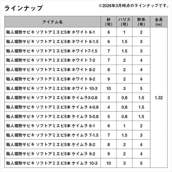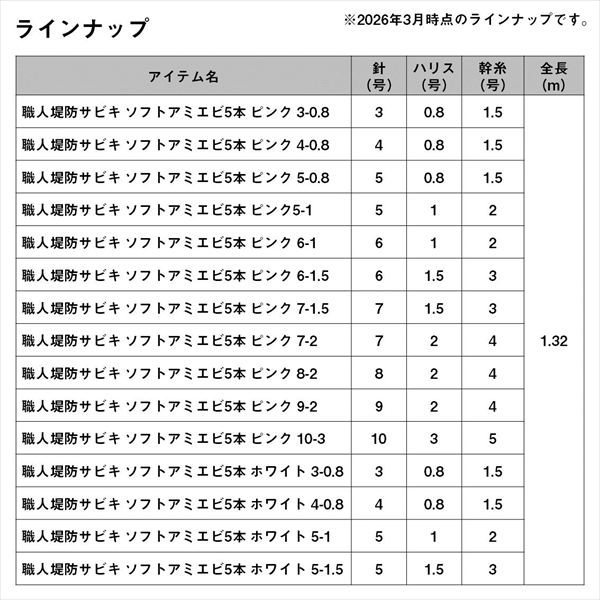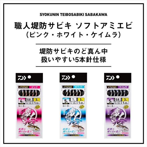 DAIWA堤防サビキのど真ん中。より釣れる仕様に生まれ変わっての完全リニューアル版!従来よりも更に釣れる、扱いやすいをコンセプトに下記をブラッシュアップ。Dフロン ステルスピンクを採用し、水中での糸の存在を感じさせにくいオリジナルラインで釣果を直結。また、どなたにも扱いやすいように5本針(全長1.32m)をコンパクト化。コンパクトロッドや、手返し等も考慮した仕様。擬餌終わり部分に極小留仕様で、擬餌との一体感がより増す仕様になり、吸い込み力もアップ。 仕掛全長(mm):132 フック(針)サイズ:8 ハリス(号):2 ハリス長さ(cm):3 フックタイプ:小アジ 銀 幹糸(号):4 ※実物と色が違って見える場合があります。あらかじめご了承下さい。