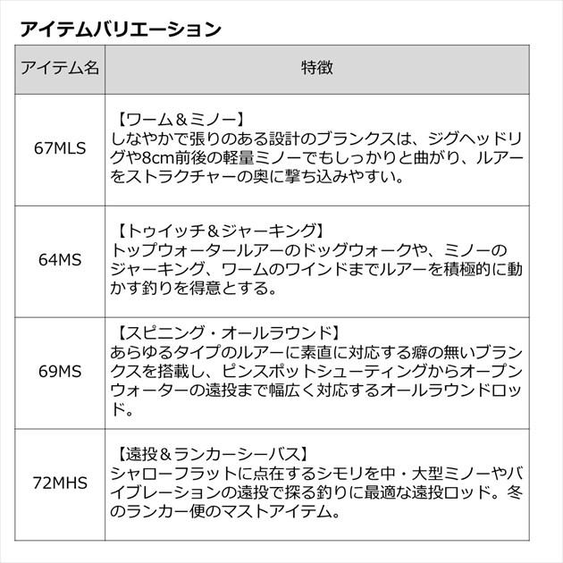 遠投性とゲーム性を高めたボートシーバスロッドのハイエンド。ロッドの基本設計とラインナップを大きく向上。■64MS・・・「トゥイッチ&ジャーキング」。トップウォータールアーのドッグウォークや、ミノーのジャーキング、ワームのワインドまでルアーを積極的に動かす釣りを得意とする。【ダイワ キャスティング情報2022】【22NEWdaiwa】 全長:1.93m 継数:2 仕舞寸法:101cm 自重:99g 先径/元径:1.6mm/9.4mm ルアー重量:7-35g 適合ラインPE:0.8-1.5号 カーボン含有率:99% ※実物と色が違って見える場合があります。あらかじめご了承下さい。