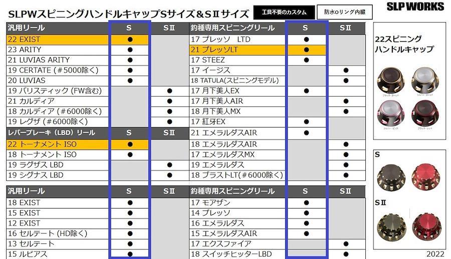〇対応機種・【S】…… 22・18EXIST、19CERTATE(LT5000除く)、 21LUVIAS AIRITY、20LUVIAS、 22TOURNAMENT ISO LBD、21PRESSO ほか・【S2】…… 19BALLISTIC(FW含む), 21・18CALDIA, 21FREAMS(LT6000除く)、18TATULA, 18月下美人 MX、21月下美人 X ほか