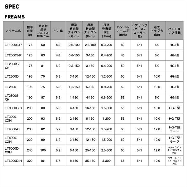 夢のカタチは自由自在。新たに「AIRDRIVE DESIGN」を採用した、グローバルスタンダードモデル。■LT3000D-C・・・LT3000に比べワンサイズ小さいボディを搭載したアイテム。ハンドル1回転80cm、ナイロン16lb(4号)150m巻でエサ釣りにも対応。またコンパクトボディによる軽量性を活かし、様々な釣りに対応可能なユーティリティモデル。【対象魚目安】餌釣り、テンヤ真鯛、エギング、シーバス、SLJ、本流トラウト など 重量(g):200 巻取長さ/ハンドル1回転(cm):80 ギア比:5.3 巻糸量ナイロン(号-m):4-150 巻糸量ナイロン(lb-m):16-150 巻糸量PE(号-m):1.5-300 ベアリング:5/1 最大ドラグ力(kg):10.0 ハンドルアーム長(mm):55 ハンドルノブ交換サイズ:S ハンドルノブ仕様:HG-T型 ※実物と色が違って見える場合があります。あらかじめご了承下さい。