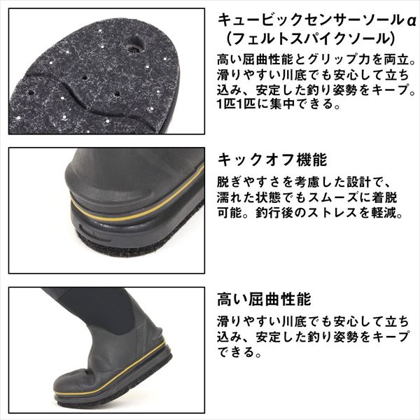 鮎師の求める全てを詰め込んだ鮎釣り専用スペシャルスリムウェーダー。川での過酷な環境下でも、快適さと安心感を追求。高耐久素材「タフフィットクロスネオ」による優れた防水性・着脱性をはじめ、膝を守る「インパクトガード」やズリ落ちを防ぐ「シャークスキン」など、多彩な機能を搭載。さらに、交換式ソール「ベリピタロックシステム」や高グリップ性能の「キュービックセンサーソールα」により、滑りやすい川底でも安定した立ち込みを実現。釣行の集中を妨げないフィット感と快適性で、鮎友釣りに最適化された、安心して楽しめる至高のスリムウェーダー。 サイズ:LLA-LL カラー:ブラック ※実物と色が違って見える場合があります。あらかじめご了承下さい。