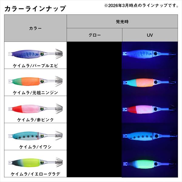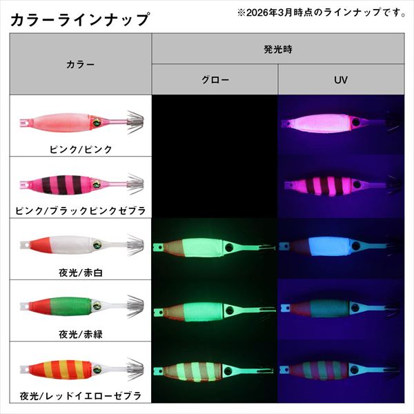 異素材の組み合わせがもたらす新感覚ドロッパー。硬質素材のボディーの輝きと軟質素材のボディーの組み合わせで、集イカ性能と深く抱き込むことでのフッキング率の向上を実現した新感覚ドロッパー。絶妙な浮力と発光ボディで、イカを誘いバイトに持ち込む。バイトしてからはマシュマロボディのベイトフィッシュライクな触感で、より深く抱き込みフッキングチャンスを増やす。強度と刺さりの良さを両立した日本製素材のスーパーシャープフックにより、フッキング率が向上。 サイズ:70mm タイプ:スローシンキング カンナ:シングルカンナ(0.6mm5本立て) ※実物と色が違って見える場合があります。あらかじめご了承下さい。