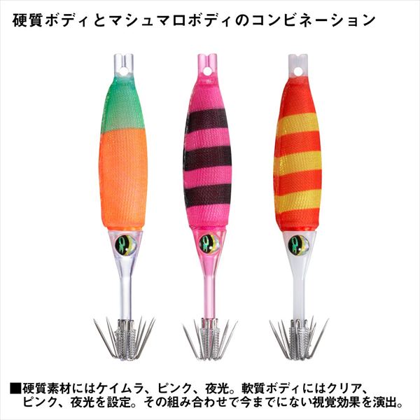 異素材の組み合わせがもたらす新感覚ドロッパー。硬質素材のボディーの輝きと軟質素材のボディーの組み合わせで、集イカ性能と深く抱き込むことでのフッキング率の向上を実現した新感覚ドロッパー。絶妙な浮力と発光ボディで、イカを誘いバイトに持ち込む。バイトしてからはマシュマロボディのベイトフィッシュライクな触感で、より深く抱き込みフッキングチャンスを増やす。強度と刺さりの良さを両立した日本製素材のスーパーシャープフックにより、フッキング率が向上。 サイズ:70mm タイプ:スローシンキング カンナ:シングルカンナ(0.6mm5本立て) ※実物と色が違って見える場合があります。あらかじめご了承下さい。