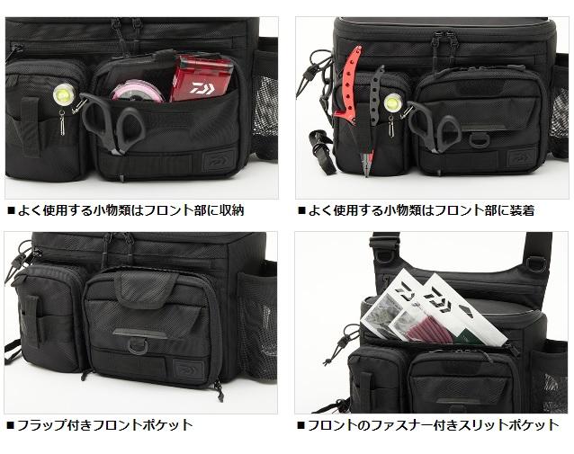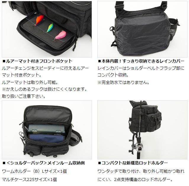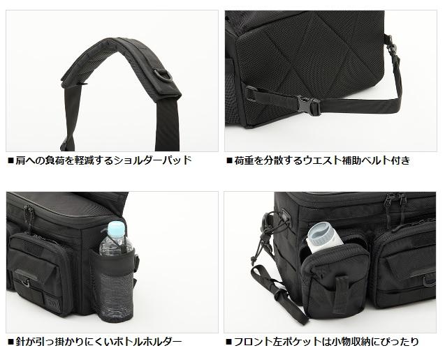 高次元の機能性を凝縮したハイパフォーマンスモデル。本体内部が見やすく、出し入れし易い「大開口U字型ファスナー」。ひんぱんに使用するルアーを収納し取り出しラクラク、「ルアーマット」付きフロントポケット。小物の収納にぴったりなスリットポケット。コンパクトな「新構造ロッドホルダー」装備。「針が引っ掛かりにくい樹脂製メッシュを使用したペットボトルホルダー」(600ml程度まで)。プライヤーホルダー、Dリング、ベルトループ装備。取り外しのできる大型ショルダーパッド付き。すっきり収納できるレインカバー内蔵(完全防水ではありません)。バッグのブラつきを抑えるウエスト補助ベルト。蒸れを抑えるメッシュパッド背面。 本体外寸:約10×29×19cm 素材:ポリエステル ※実物と色が違って見える場合があります。あらかじめご了承下さい。