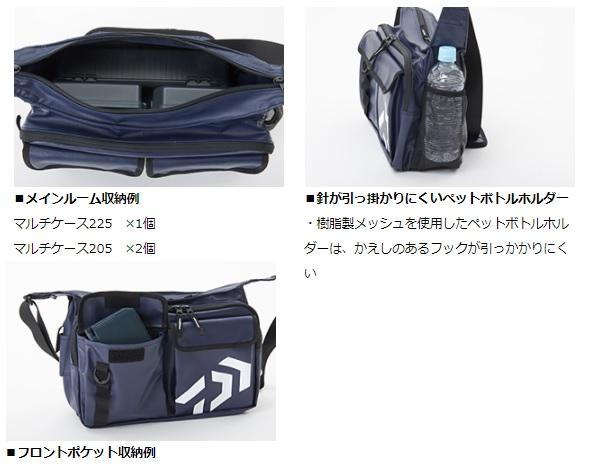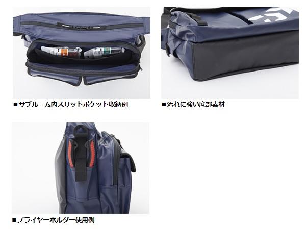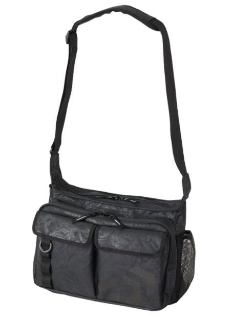 実用的な機能・仕様を満載し、陸っぱりを中心に幅広いフィッシングシーンで活躍する汎用ショルダーバッグ。メインルームに中型ボックス(26×19cm程度)を2-3個収納可能。小物類を別けて収納できるフロントポケット、内ポケット付き。プライヤーホルダー、Dリング、ベルトループ付き。針が引っ掛かりにくい樹脂製メッシュを使用したペットボトルホルダー。肩への負担を軽減するパッド付き肩ベルト。 本体外寸:約15×33×24cm 素材:POLYESTER、PVC ※実物と色が違って見える場合があります。あらかじめご了承下さい。