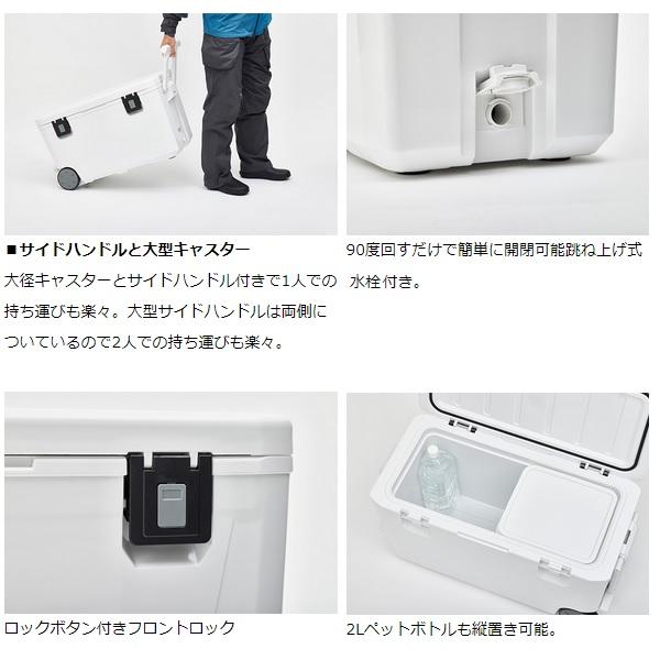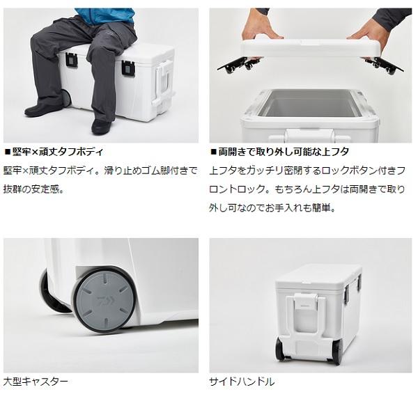 頑丈×楽々! DAIWA史上最もタフなクーラーが新登場!■堅牢×頑丈!タフボディ ■大径キャスターとサイドハンドル付きで1人での持ち運びも楽々 ■大型サイドハンドルは両側についているので2人での持ち運びも楽々 ■上フタをガッチリ密閉するロックボタン付きフロントロック。もちろん上フタは両開きで取り外し可なのでお手入れも簡単 ■90度回すだけで簡単に開閉可能、手も濡れない跳ね上げ式水栓付き ■容量43Lで中型から大型魚まで幅広く対応 ■2Lペットボトルも縦置き可能な背高仕様 ■滑り止めゴム脚付きで抜群の安定感 ■ウレタン断熱の高保冷モデルと軽量スチロールモデルをラインナップ ■クーラーにぴったりフィットする防水プルーフケース付属 断熱材:ウレタン 自重:9.0kg 容量:43L 内寸:23×56.5×31.5cm 外寸:34×73.5×41cm 保冷力:KEEP100 ※実物と色が違って見える場合があります。あらかじめご了承下さい。 ●この商品は、別倉庫から佐川急便で発送致します、運送会社のご指定はできません。
