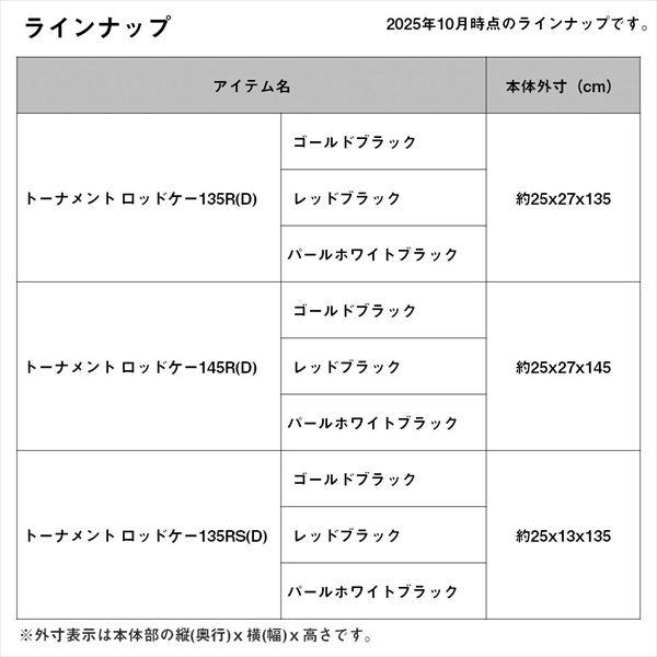 ダイワ磯ロッドケースの最高峰!●Rタイプ :必要な小物まで大容量に収納できる新形状ロッドケース ◆メインルームが大きく開口し中を確認しやすい新構造 ◆衝撃からの保護性を極めた「ハードボディー構造」 ◆本体部のつぶれを防ぎ剛性を高める「ファスナー強化ボード」内蔵 ◆圧倒的にサビに強い「ステンレスファスナースライダー」を採用 ◆水、汚れが拭き取りやすく磯場の上でも滑りにくい表面素材 ◆立体成型「大容量外ポケット」装備 ◆握りやすく滑りにくい「2重成型ハンドル」 ◆滑りにくく衝撃に強い「2重成型ボトムカップ」 ◆肩にフィットしやすく、つかみ易いグリップホール付き「ショルダーパッド」 ◆リール付きロッドを2本まで収納できる「段差収納システム」 ◆収納したリールの保護性を高める「リールプロテクター」 ◆玉枠付き玉ノ柄の飛び出しを防ぐ「(玉ノ柄)ストッパーベルト」◆予備竿等を区分けできるセパレーター、ロッド固定ベルト付き 本体外寸(cm):約25×27×135 自重(kg):3 ※実物と色が違って見える場合があります。あらかじめご了承下さい。