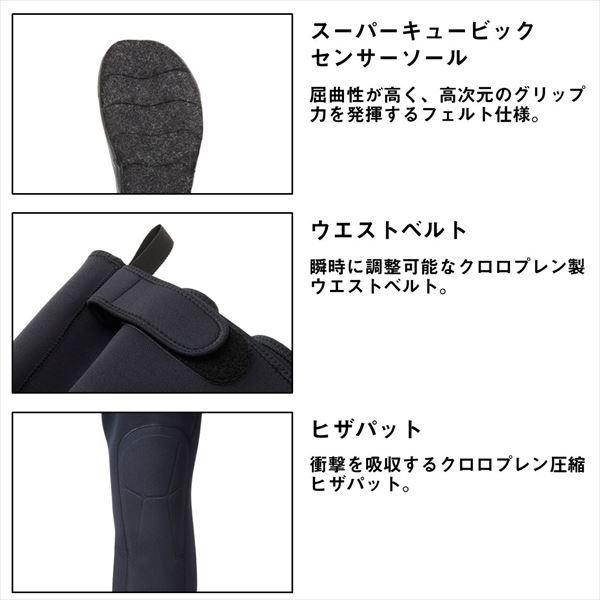 高機能スタンダードスリムウェーダーがさらに使いやすくリニューアル。前モデルより更に3cmの股上の長さをアップ!上からの水の浸入を防ぎ、より立ちこめる仕様に。保温性と防護性の高い3.5mm厚クロロプレン。屈曲性が高く、高次元のグリップ力を発揮するスーパーキュービックセンサーソール(フェルトソール)。甲周りは柔軟なラバーを採用し、機動性アップ。背中側の履き口を高くし、より立ちこみに有利なハイバックカット仕様。膝には、厚いクロロプレンを圧縮した膝パッド採用。膝の可動を邪魔しないデザインになっており、おとり交換の際にも安心して膝をつけられる。つま先に硬質ラバーを採用したつま先ガード。瞬時に調整可能なクロロプレン製ウエストベルト。干すのに便利なハンガーループ付き。素早く脱げるキックオフ。スタンダードウェアにも、鮎SPウェアにも合うゴールドカラーの鮎師向けデザイン。 サイズ:LLB-LL カラー:ブラック ソールタイプ:フェルトソール タイプ:先丸中割 素材:3.5mm厚クロロプレン ※実物と色が違って見える場合があります。あらかじめご了承下さい。