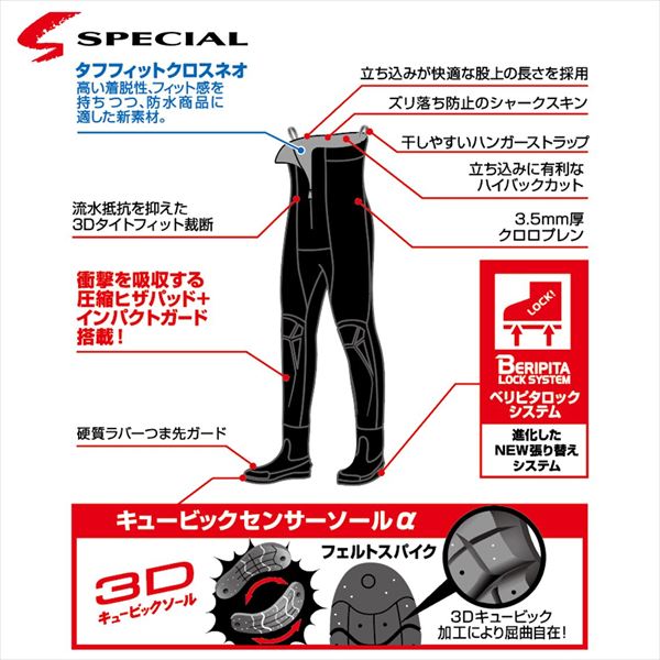 鮎師の求める全てを詰め込んだ鮎釣り専用スペシャルスリムウェーダー。川での過酷な環境下でも、快適さと安心感を追求。高耐久素材「タフフィットクロスネオ」による優れた防水性・着脱性をはじめ、膝を守る「インパクトガード」やズリ落ちを防ぐ「シャークスキン」など、多彩な機能を搭載。さらに、交換式ソール「ベリピタロックシステム」や高グリップ性能の「キュービックセンサーソールα」により、滑りやすい川底でも安定した立ち込みを実現。釣行の集中を妨げないフィット感と快適性で、鮎友釣りに最適化された、安心して楽しめる至高のスリムウェーダー。 サイズ:MA-L カラー:ブラック ※実物と色が違って見える場合があります。あらかじめご了承下さい。