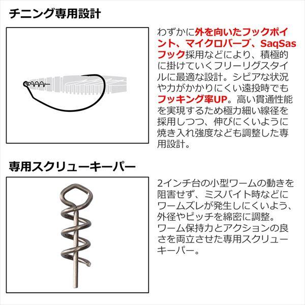 フリーリグチニング対応のスクリューキーパー付き専用フック。大阪淀川をホームとして活動しているチニングの伝道師、もりぞーこと森浩平テスター監修、スクリューキーパー付きワームフック。遠投かつボトムを探ることが多いチニングにおいて、根掛かりやミスバイトでのワームのズレはチャンスロスや致命的な手返しの悪さに繋がる。しっかりワームを保持するスクリューキーパーを搭載することで、それらのズレを軽減し魚と出会う確率を上げ、チニング専用に設計されたフックがターゲットの顎を捉える。 フック(針)サイズ:♯2 入数:6 ※実物と色が違って見える場合があります。あらかじめご了承下さい。
