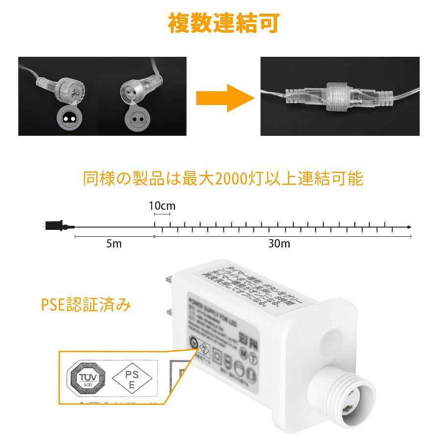 【AC電気式Ledイルミネーションライト】このストレートタイプのイルミネーションライトはAC電気式で、通常のソーラー式LEDストリングライトの短い点灯時間と違い、曇りや雨、雪の日にもこの飾りライトはお必要に応じて一晩中、或いは毎日24時間点灯しても実現できます。また電池式イルミネーションの速く電池消耗もなくて経済的です。連日の悪天候でも室内で輝いてキラキラに点灯でき、雰囲気を盛り上げて、お気持ちも楽々! 【2000灯までも連結可能・PSE認証済み】この屋外 防水 イルミネーションライトは日本の電気安全法に基づく技術基準に適合しますので、ご安心にお使いください。またストレート イルミネーションライトはACコンセントから取り外しも可能で、同じ製品を複数連結してもピカピカに点灯できます。それで、業務用の装飾ストリングライトとして最適です。※ご注意:1000灯以上に連結すれば、ライトは少し暗くなりますので、ご了承ください。 【8つ点灯モード・モード記憶可能】このクリスマス飾り ライトはウォームカラーでロマンチックかつ癒しの雰囲気を作り出せます。他に雰囲気に合わせて常時点灯や点滅など全8つの点灯パターンを設定できるLEDフェアリーライトです。またモード記憶機能も付き、ライトの電源を切っても、次回も前回と同じ点灯モードで光ります。 【安心させるタイマー機能付き】LED ストリングライトの電源をずっと接続すれば、毎日ほぼ同じ時点から点灯して約6時間後消灯すると設定できるタイマー機能も付いています。そのタイマー機能により、自動的にライトの電源オンとオフを設定でき、消灯を忘れても電気の無駄遣いも心配しませんし、省エネにも貢献します。 【屈曲性&柔軟性・耐久性&耐寒性】led ストリングライトの全長は25m(リード線5m含め)で、200枚ジュエリーのようなledビーズもついています。屈曲性と柔軟性が優れてるプレミアムな銅線で、優れている耐久性と耐寒性により、数千回以上を折り曲げても、損傷や性能の差異は見られませんし、冬でも柔らかくて飾りやすいです。 【IP44防水・幅広い実用性】屋外電飾LEDライトとして、ライト部はIP44の高い防水レベルも備えて、水が怖くないで、雨など悪天候でも平気に使えます。他に広場、街路樹、庭木など屋外用だけではなく、屋内飾りライトとして、壁や窓、玄関前、ベランダ、
