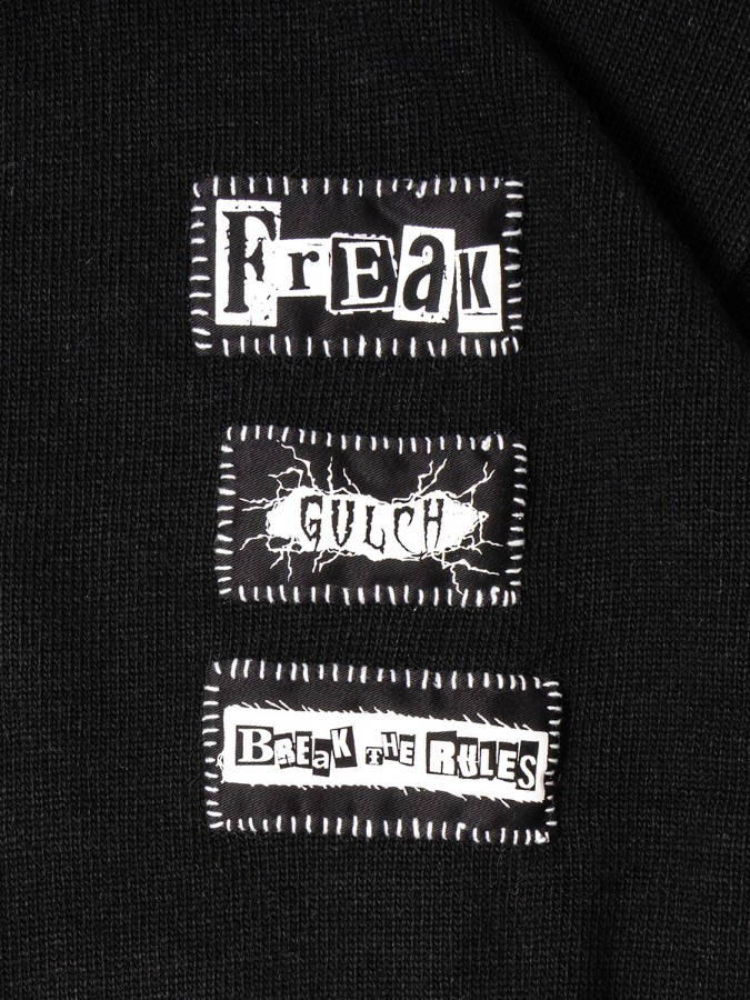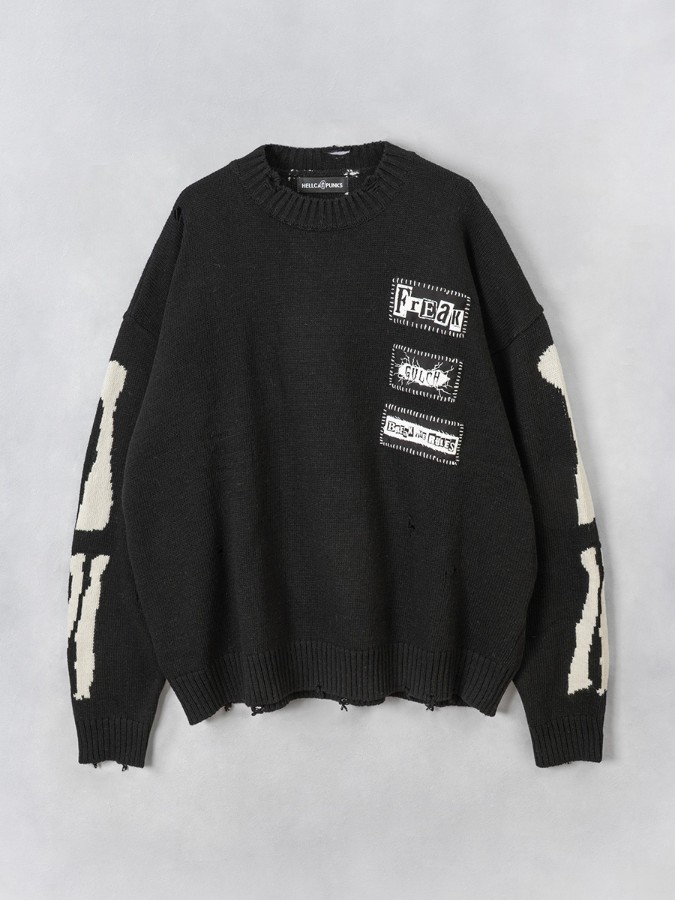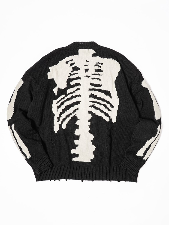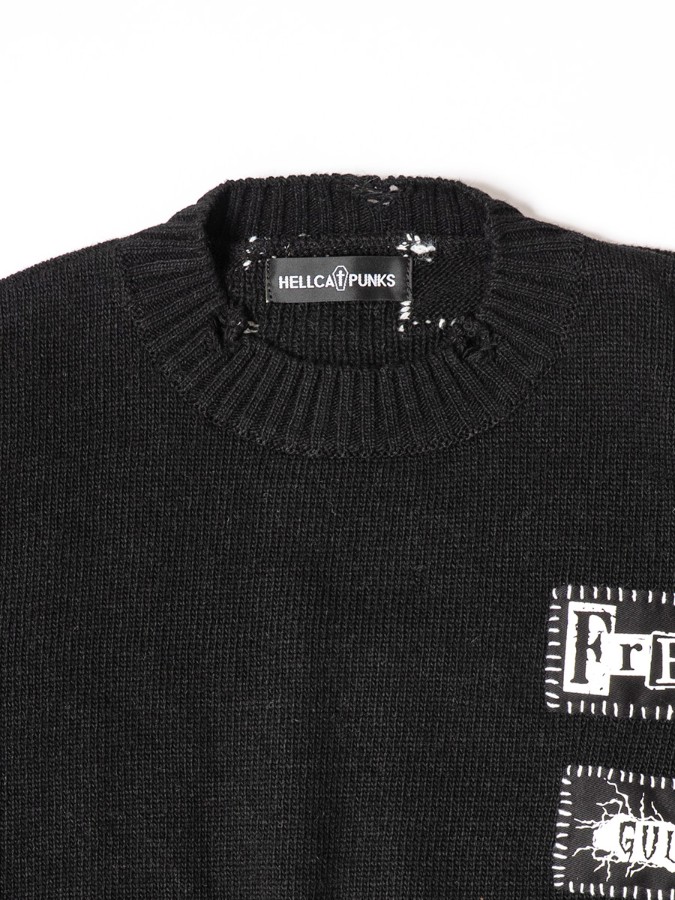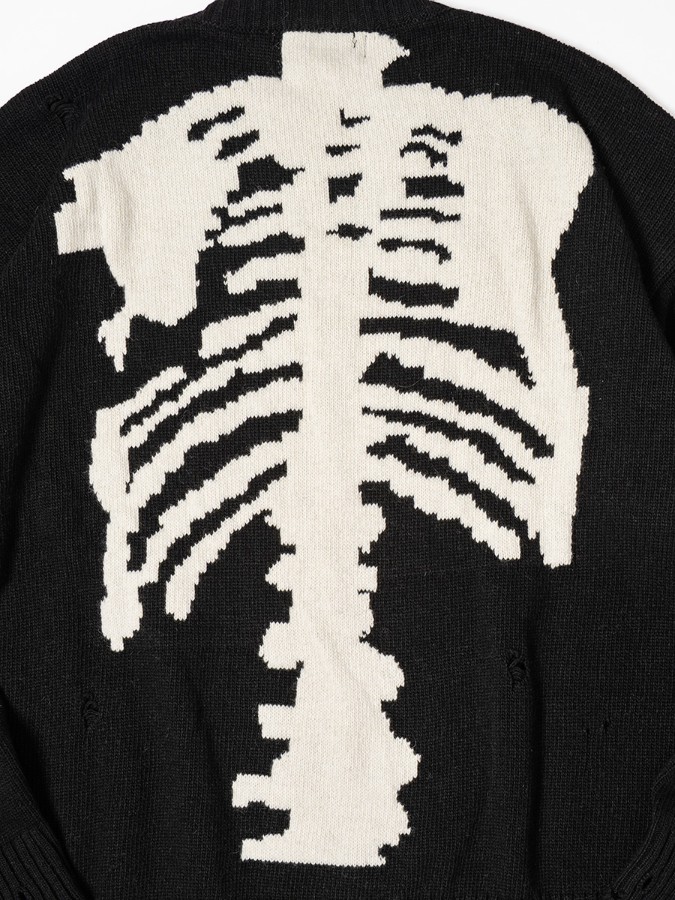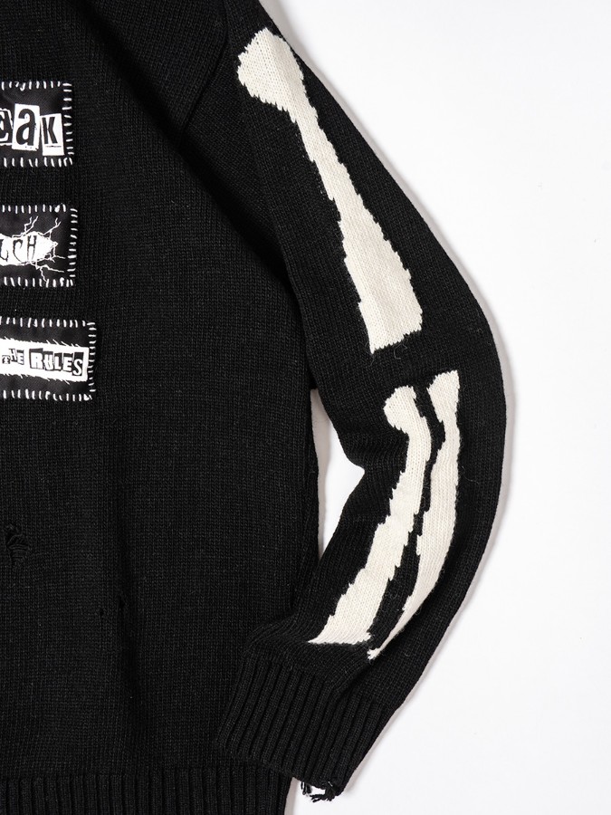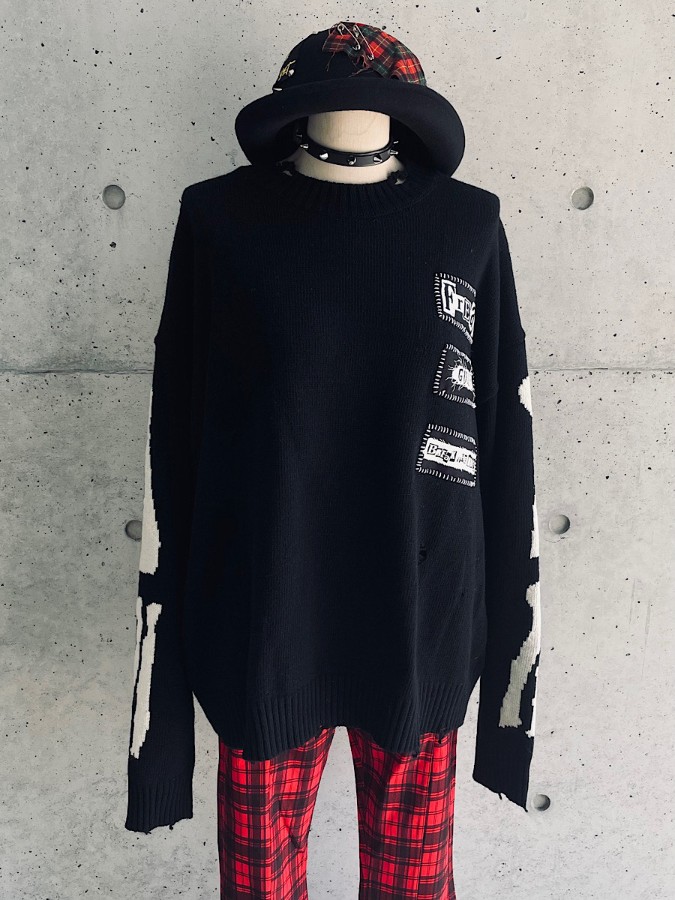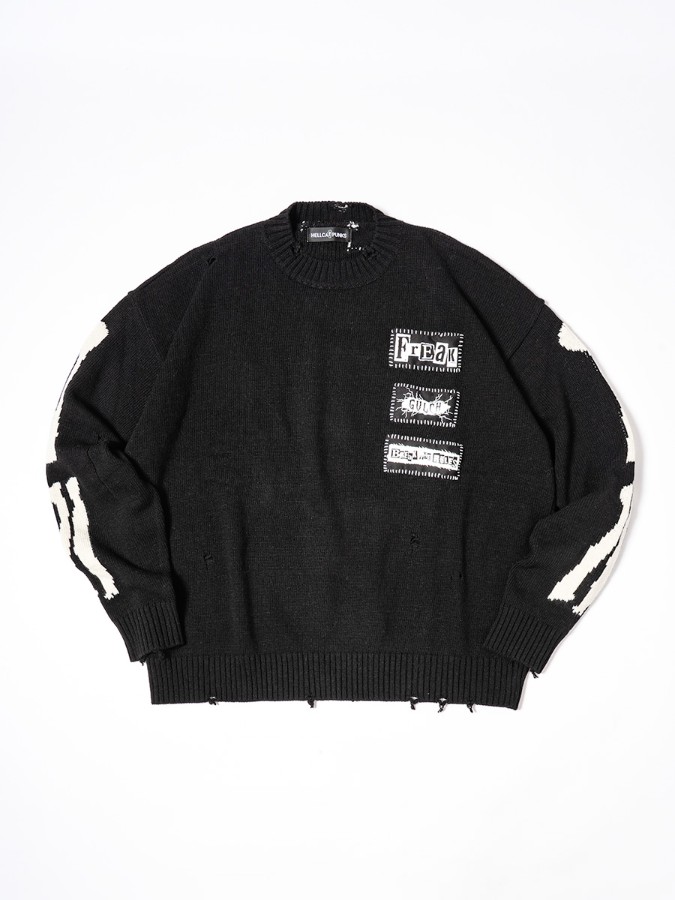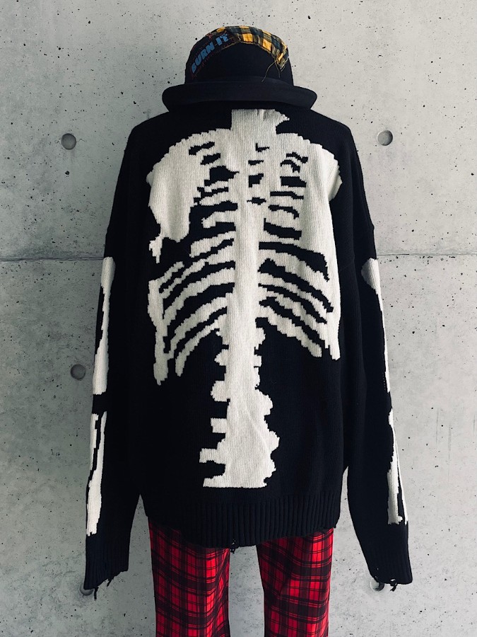 ダメージ加工とパッチを施したニット。袖とバックのボーンデザインが目をひく1枚★男女問わず着用可能なFサイズです。