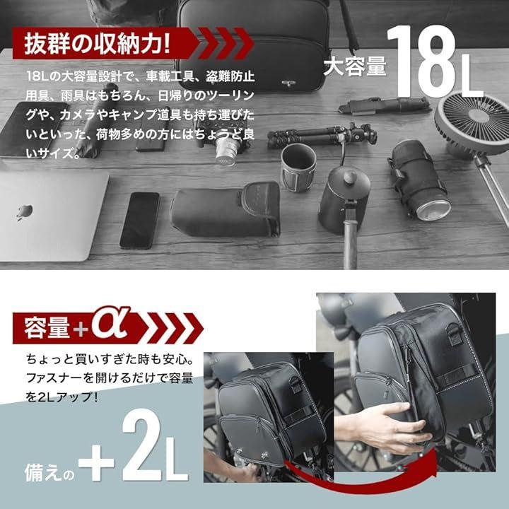 「18Lの大容量収納バッグ」この大容量収納バッグは、外寸が40x29x16.2cm、18Lの大容量。