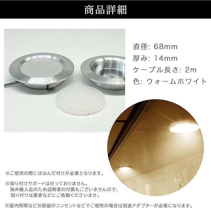 「商品情報」明るさ:6500K 直径: 68mm 厚み: 14mm ケーブル長さ: 2m 色: ホワイト *本商品は海外製品のため、輸送中に細かい傷が生じることもございます。