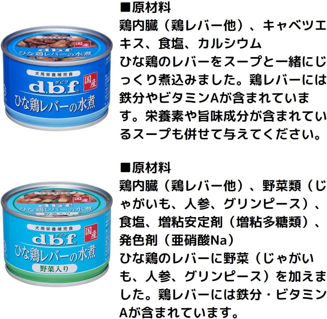 大人気デビフの缶詰ドッグフード(150g)の水煮セットです!■ひな鶏レバーの水煮■ ひな鶏のレバーをスープと一緒にじっくり煮込みました。鶏レバーには鉄分やビタミンAが含まれています。栄養素や旨味成分が含まれているスープも併せて与えてください。■ひな鶏レバーの水煮 野菜入り■ ひな鶏のレバーに野菜(じゃがいも、人参、グリンピース)を加えました。鶏レバーには鉄分・ビタミンAが含まれています。