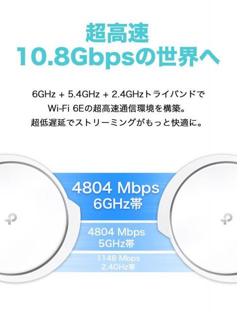Wi-Fi6E6GHz対応Wi-Fi6Eで6GHzに対応。4804Mbps(6GHz)+4804Mbps(5GHz)+1148Mbps(2.4GHz)