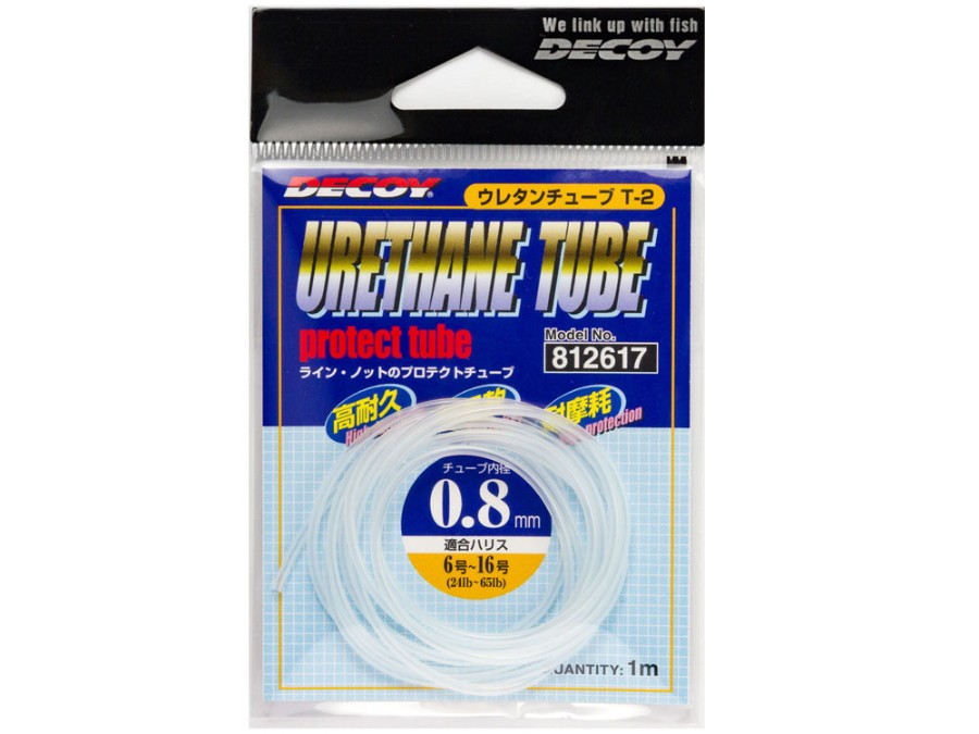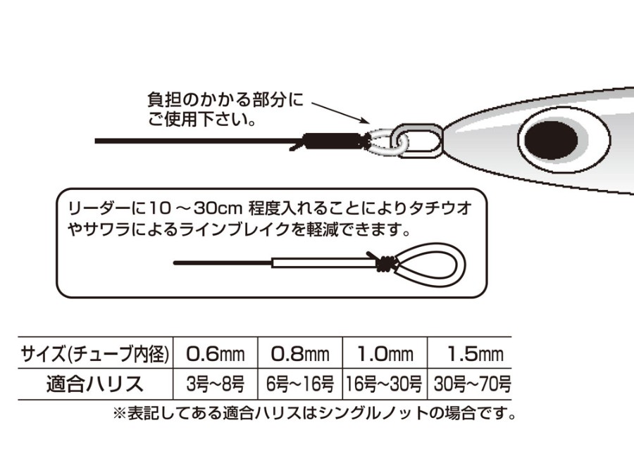 リーダーのノット、ルアーへの接触等で負担のかかる部分の強化、保護の為の高耐久、耐摩耗、超柔軟な高品質ウレタンチューブです。長くとり、チューブを入れて結束することで、タチウオ等の鋭い歯をもつ魚からリーダーを保護できます。