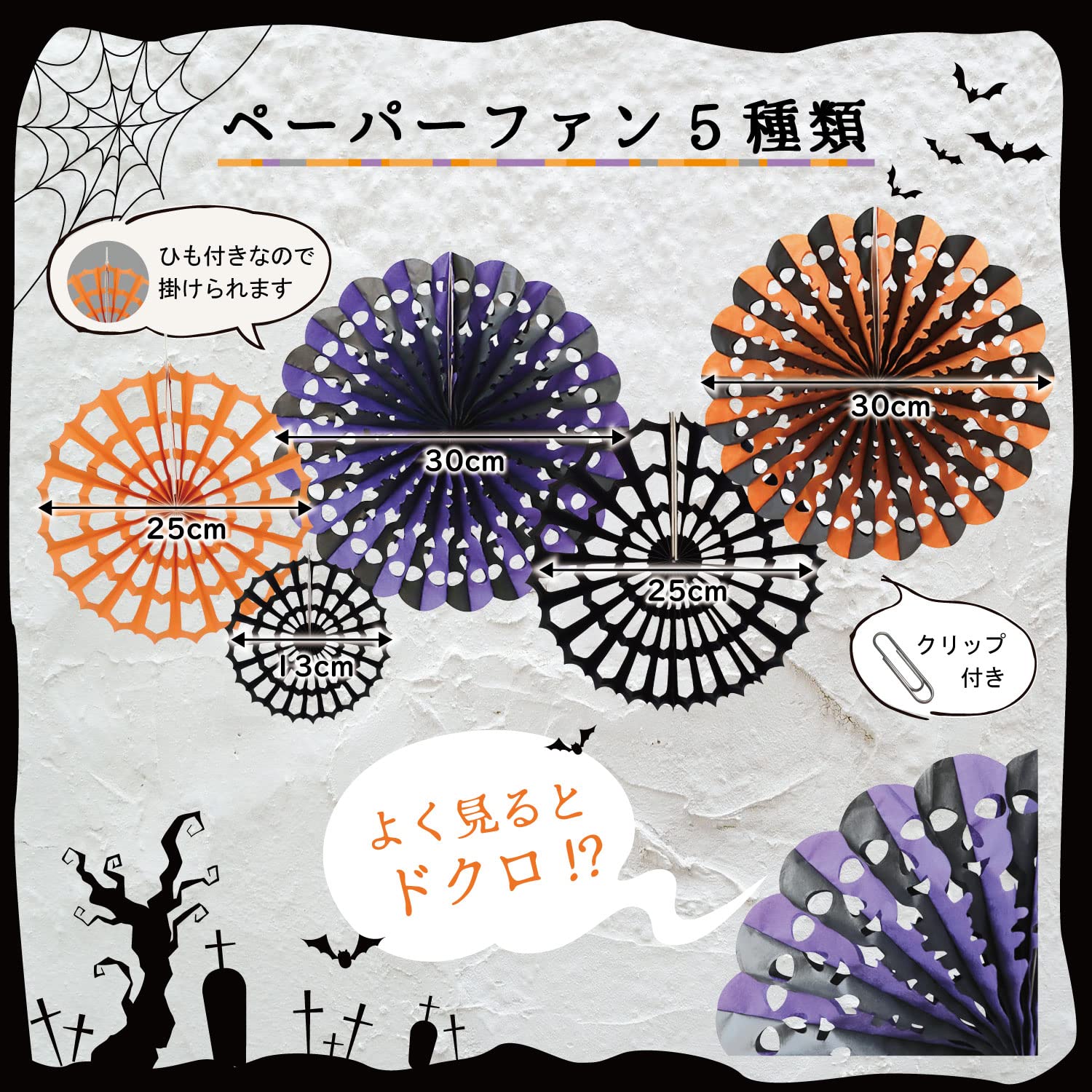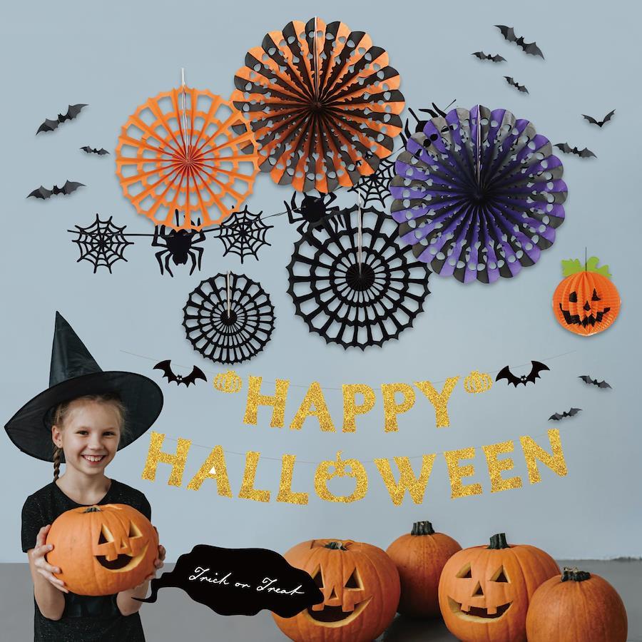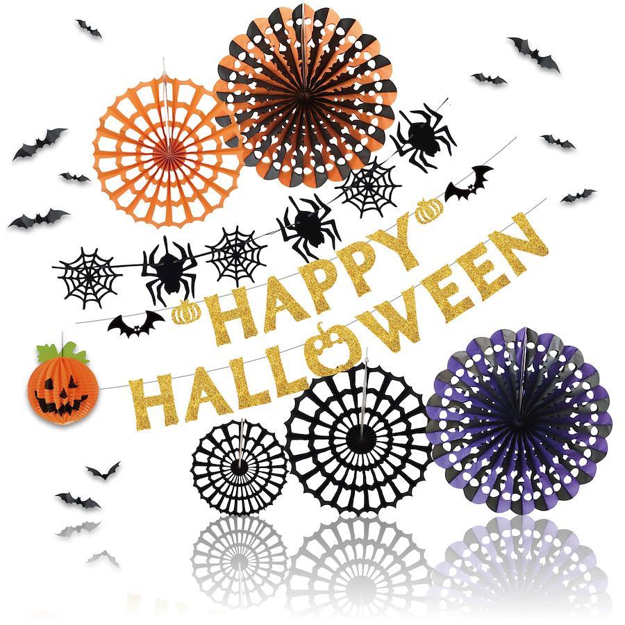 【ハロウィンカラーの飾り付け!】オレンジ、パープル、ブラックのペーパーファンに、かわいい飾りアイテムがたくさん付いたデコレーションセットです。ハロウィンパーティーの装飾や、店舗装飾、ハロウィンイベントにぴったりの飾りセットです。deerzon(ディアゾン)は「子供を笑顔に。家族を笑顔に。」をコンセプトとしたブランドです。お子さまが喜ぶバルーンセットを多く提案しております。お子さまのお気に入りのバルーンがきっと見つかります。ぜひストアページにご来店ください!【かわいいアイテムたくさん】ハロウィン ペーパーファンセット!①ハロウィンカラーのペーパーファン ②クモの巣モチーフのペーパーファン ③3Dコウモリステッカー ④クモの巣ガーランド ⑤かぼちゃハニカムボール ハロウィンをかわいく彩るデコレーションセットです。【イベントやパーティーに】おしゃれなhappy halloweenガーランドと、ペーパーファン、かぼちゃハニカムボールまでセットになっておりますので、ハロウィンパーティーがすぐに始められます。お子さまから大人まで楽しめる飾りセットです。【手軽に飾れる】ペーパーファンとハニカムボールは開いてクリップで留めるだけ、ガーランドはヒモに通すだけで飾れます。【免責事項】メーカーによる商品リニューアルに伴いパッケージ(内容量も含む)変更が行われた場合、新パッケージでお届け致します事ご了承願います。