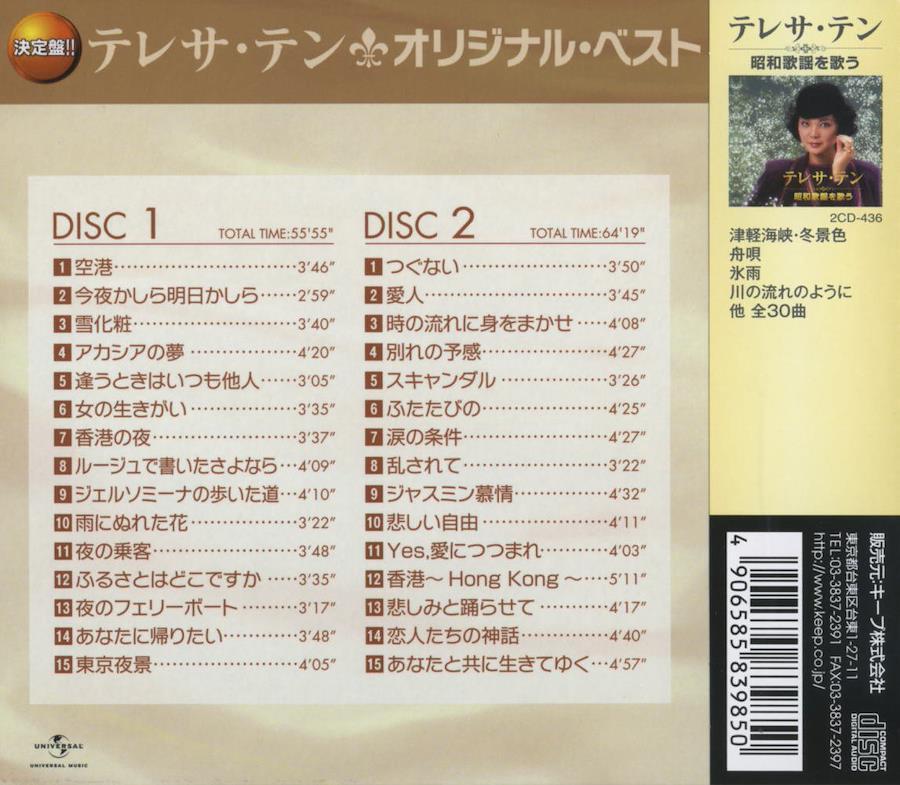 ディスク 21. つぐない2. 愛人3. 時の流れに身をまかせ4. 別れの予感5. スキャンダル6. ふたたびの7. 涙の条件8. 乱されて9. ジャスミン慕情10. 悲しい自由11. Yes,愛につつまれ12. 香港 Hong Kong13. 悲しみと踊らせて14. 恋人たちの神話15. あなたと共に生きてゆく