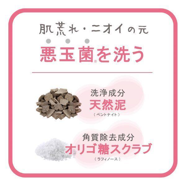 肌荒れ・ニオイ※1悩みをケア。●泥&スクラブin 肌荒れ・ニオイの原因悪玉菌(黄色ブドウ球菌など)を洗う。●お肌に必要な善玉菌※2をプラス。●弱酸性、低刺激。「スティンギングテスト済」全ての方に皮膚刺激が発生しないわけではありません。●汚れを吸着洗浄:天然泥※3(洗浄成分)。●お肌を整える:乳酸菌※2(整肌成分)。●黒ずみ※4除去:オリゴ糖スクラブ※5(角質除去成分)。●6つの無添加。パラベン、鉱物油、アルコール、シリコン、着色料、合成香料。●100%天然精油 ナチュラルハーブの香り。※1 ニオイの元になる汚れを洗い流すこと。※4 古い角質汚れ。
