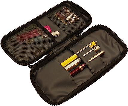 【アウトドアアイテムのような風合いで収納力の高いラウンドペンケース】 さらっとした質感が心地よいラウンドペンケースに、新色として、シャンブレーブルーとシャンブレーグレーの新色が登場しました。ビジネスシーンにも似合う落ち着いたカラーです。 アウトドアアイテムなどに使われるポリエステル素材で、軽くてタフな作りと、収納力の高さが特徴のアイテム。中面にはペンポケットと、大小のメッシュポケット付き。上段は消しゴムや印鑑などの小物、下段は「ロルバーンポケット付メモ縦型 ミニ」がぴったりと入るサイズで、メモや名刺を収納できます。表のポケ