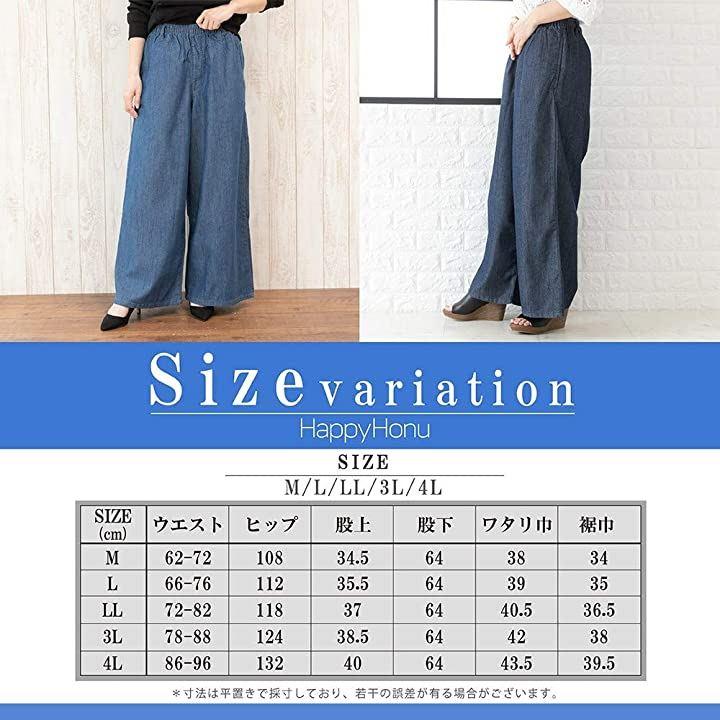 ・「モデル着用 Mサイズ 身長159cm ウエスト59cm」[Mサイズ] ウエスト:62~72cm、ヒップ:108cm、股上:34.5cm、股下:64cm、ワタリ幅:38cm、裾幅:34cm [Lサイズ] ウエスト:66~76cm、ヒップ:112cm、股上:35.5cm、股下:64cm、ワタリ幅:39cm、裾幅:35cm [LLサイズ] ウエスト:72~82cm、ヒップ:118cm、股上:37cm、股下:64cm、ワタリ幅:40.5cm、裾幅:36.5cm [3Lサイズ] ウエスト:78~88cm、ヒップ:124cm、股上:38.5cm、股下:64cm、ワタリ幅:42cm、裾幅:38cm [4Lサイズ] ウエスト:86~96cm、ヒップ:132cm、股上:40cm、股下:64cm、ワタリ幅:43.5cm、裾幅:39.5cm
