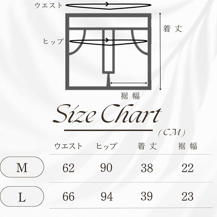 Mサイズ:ウエスト62cm、ヒップ:90cm、着丈38cm、裾幅22cm Lサイズ :ウエスト66cm、ヒップ:94cm、着丈39cm、裾幅23cm