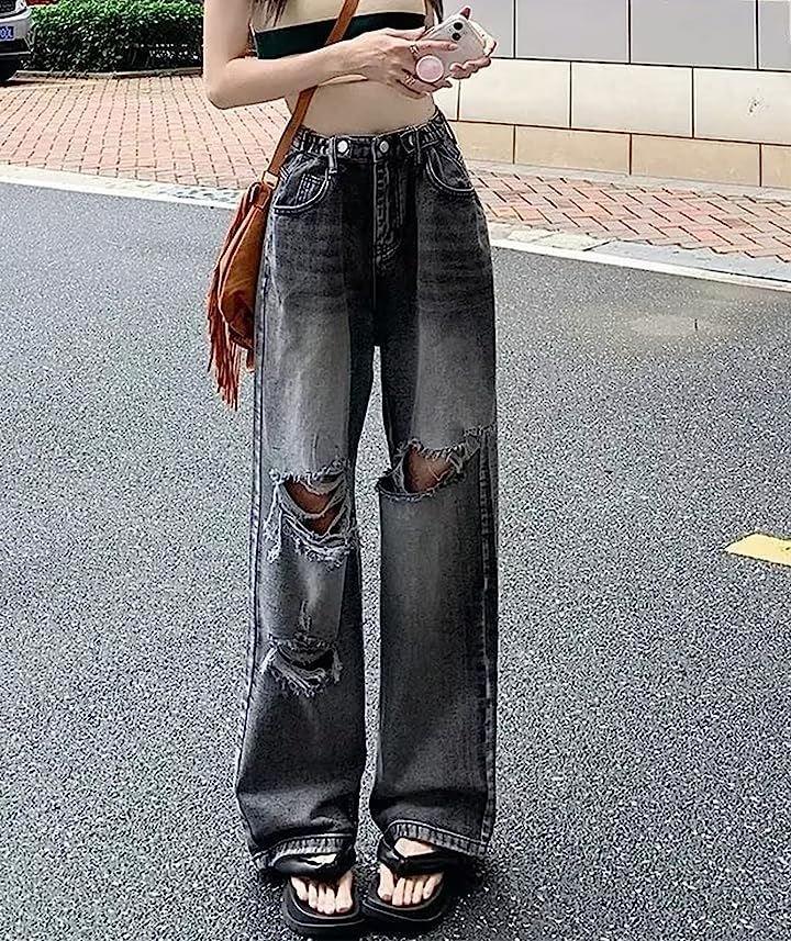 膝周りにダメージ加工されたウォッシュ加工のストレートデニムです。